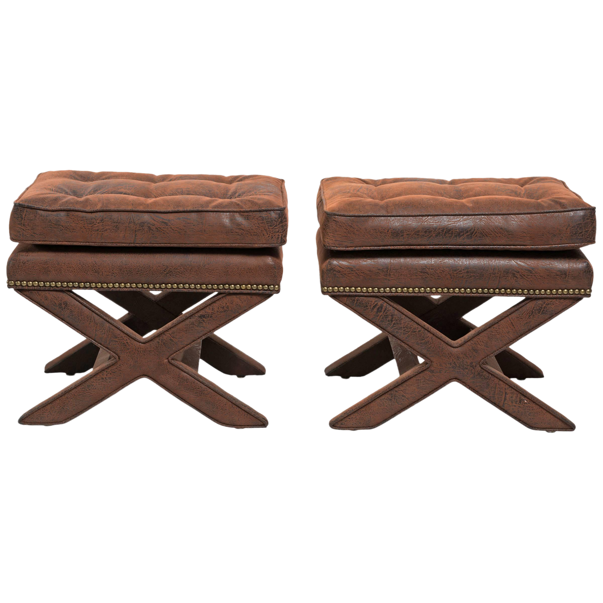 Traditional X Bench Leather Ottoman With Nailhead Trim Finish